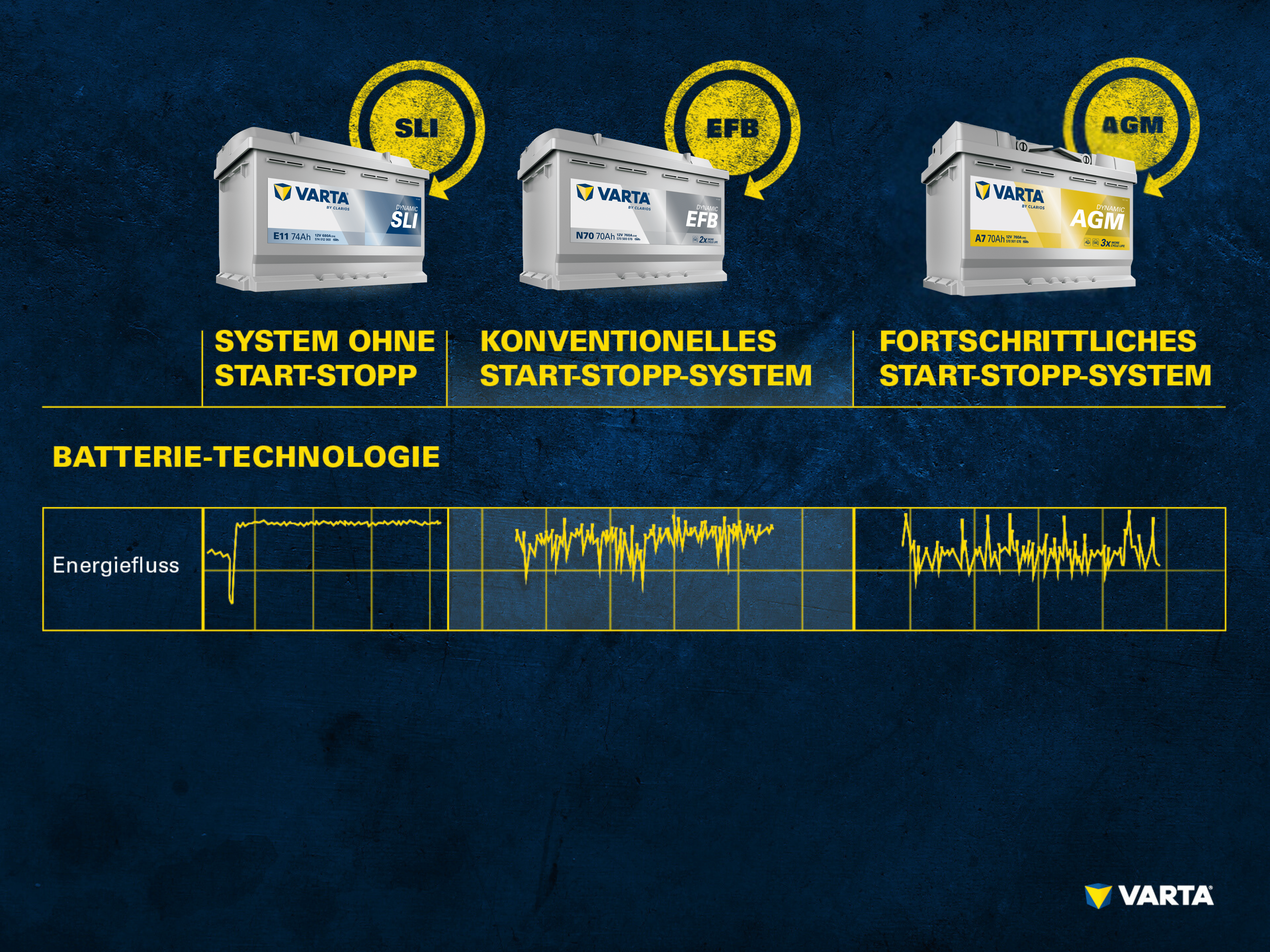 Jeder Startvorgang ist mit einer großen Energiemenge aus einer Autobatterie verbunden. Die Batterie muss in einem sehr guten Zustand sein, um zuverlässig einen hohen Anlaufstrom zu liefern. Besonders bei modernen Fahrzeugen mit Start-Stopp-Automatik wird der Motor während der Fahrt mehrmals abgeschaltet. Während dieser Phasen versorgt die Batterie weiterhin alle elektrischen Verbraucher mit Energie. Eine herkömmliche Starterbatterie (SLI) ist für diese Ladeleistung (d.h. kontinuierliches Entladen und Laden) nicht ausgelegt.
