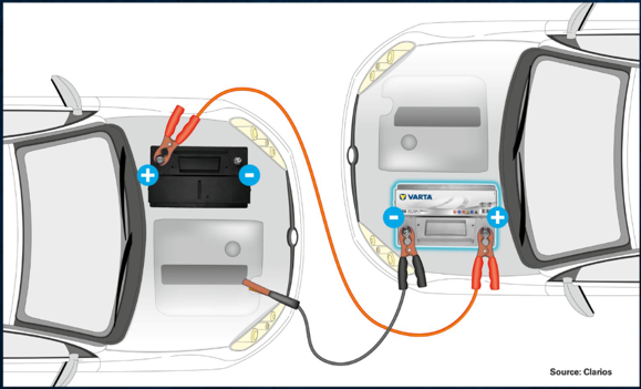 Important: The red cable is always connected to the positive terminal and the black cable to the negative terminal. First the clamp of the red cable is connected to the positive terminal of the assisting vehicle. The other end of the red cable is connected to the positive terminal of the broken down vehicle. Then the black clamp is connected to the negative terminal of the assisting battery.