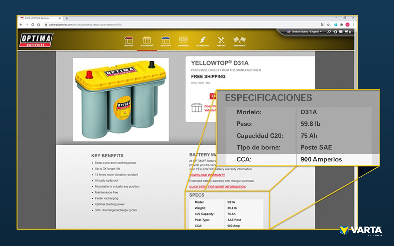 El módulo SELECCIÓN DE LA BATERÍA facilita una recomendación para montar de forma exacta la batería y poder encontrar una batería específica según el número de referencia a través del Código de Búsqueda de Batería. Sugiere alternativas para un rendimiento mejorado e incluye prácticamente todos los modelos de vehículos Start-Stop.