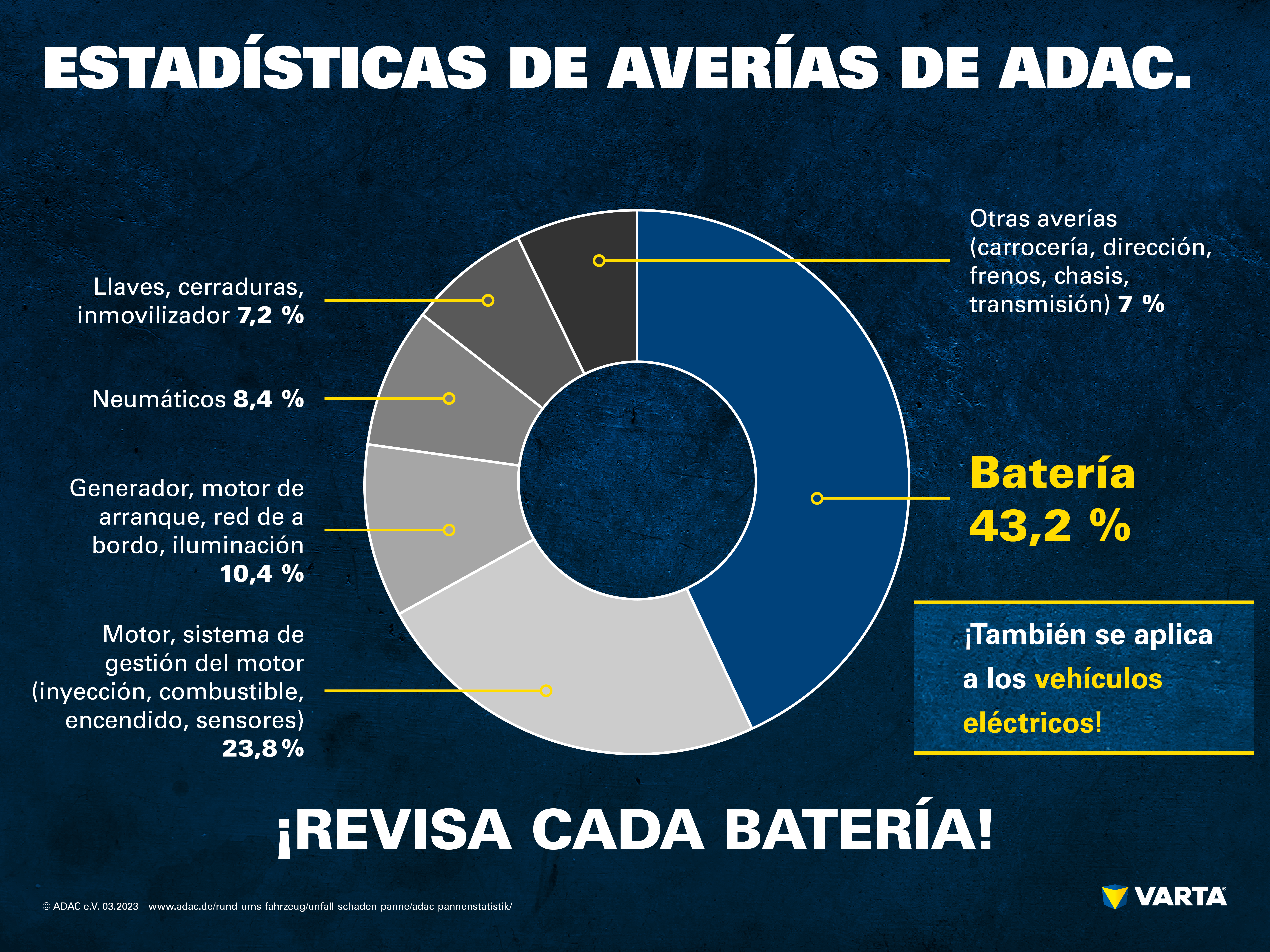 El 43,22% (ADAC 2022: https://www.adac.de/rund-ums-fahrzeug/unfall-schaden-panne/adac-pannenstatistik/) de todas las averías de los vehículos se deben a problemas con la batería: asegúrate de prevenirlos.