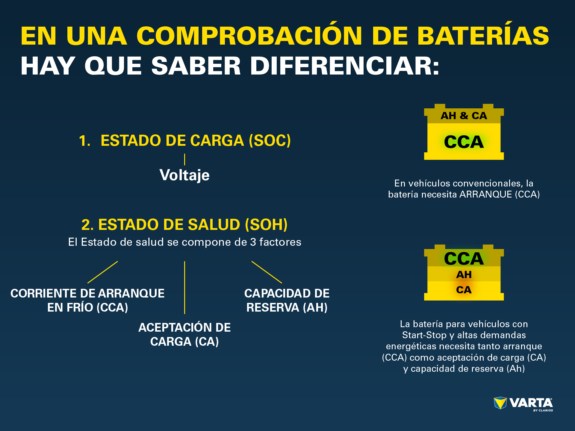 El SOC puede determinarse de forma sencilla midiendo la tensión. Para comprobar el SOH, en cambio, se requiere un procedimiento complejo para hacer un diagnóstico fiable del estado de la batería. Para determinar el SOH se tienen en cuenta, entre otras cosas, la capacidad de arranque en frío, la capacidad residual (Ah) y la aceptación de carga de la batería.