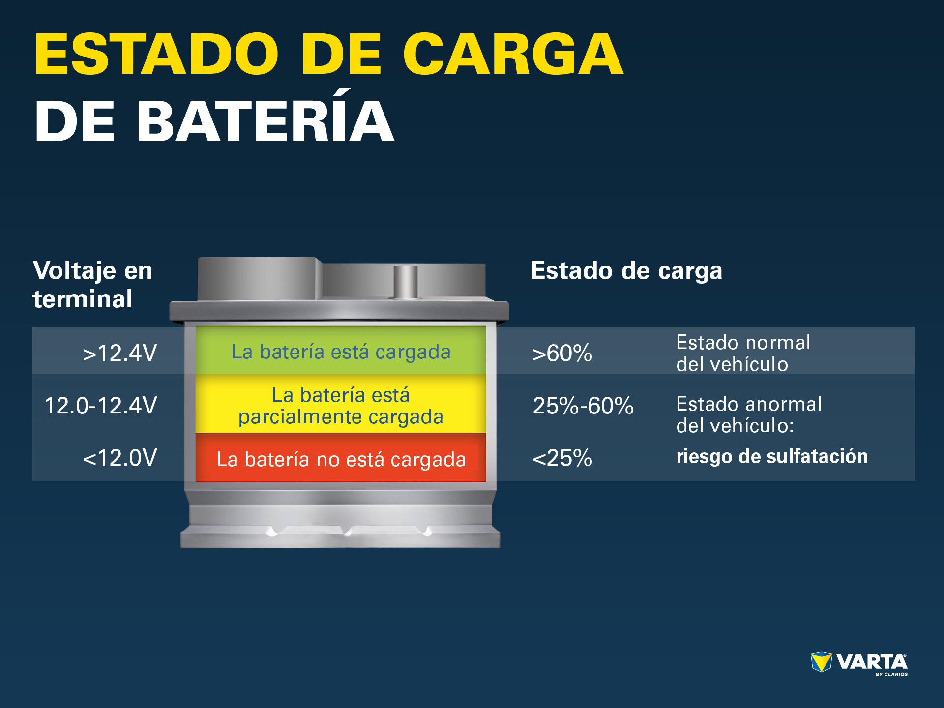 Como el esfuerzo principal que soporta una batería de arranque convencional es el proceso de carga y ya no se producen más descargas después de ser cargada por el generador, la corriente de arranque en frío es determinante en este caso. Como consecuencia del paso del tiempo y el desgaste, la capacidad de la batería para proporcionar corrientes elevadas disminuye gradualmente. Además, cuanto más baja es la carga (calculada midiendo la tensión del circuito abierto), menor es la posible carga que puede suministrarse durante el proceso de carga.