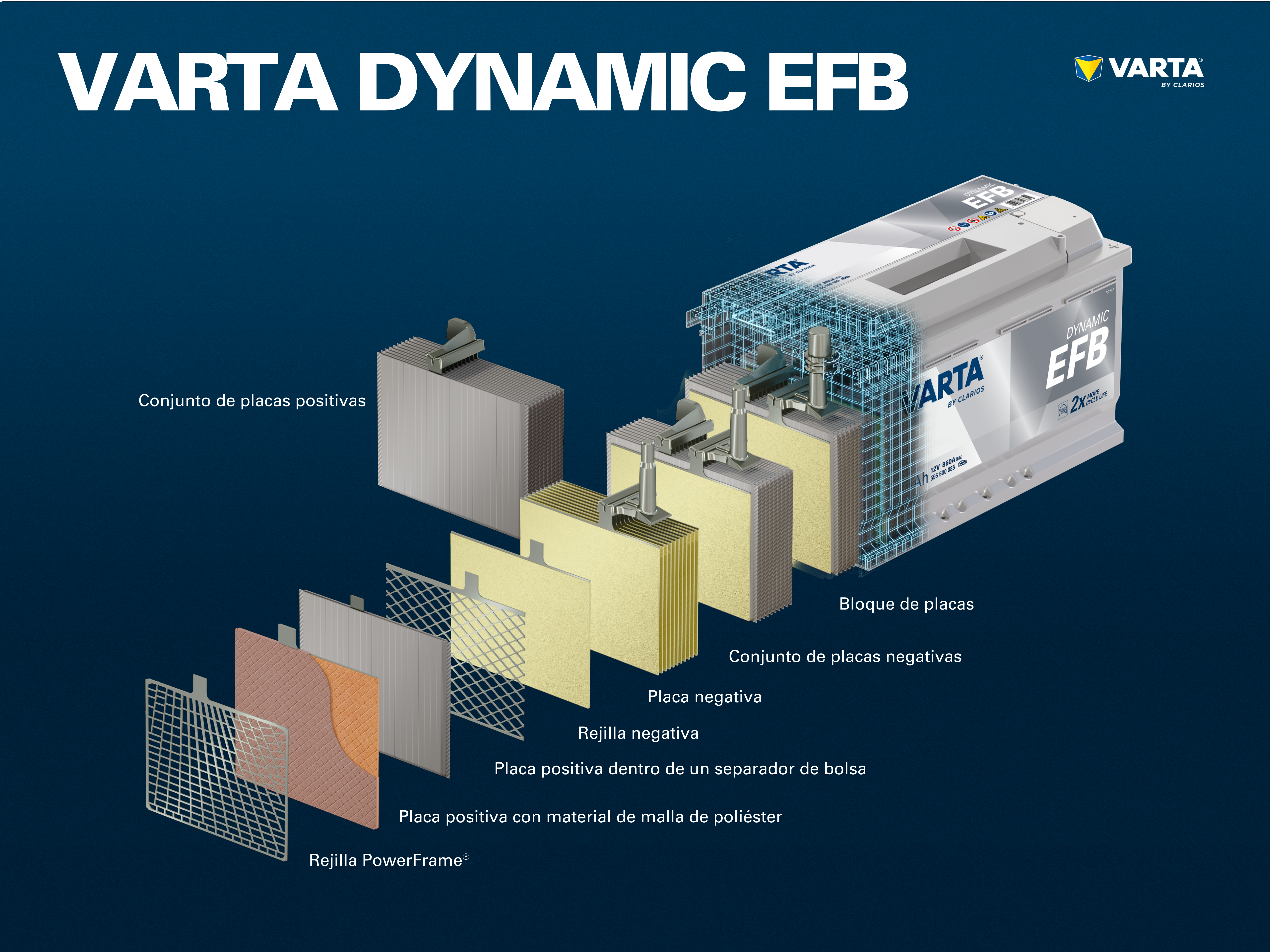 Las baterías EFB son el resultado del desarrollo de las baterías de plomo-ácido convencionales. El material de polifibra adherido a la superficie de la placa positiva garantiza que la EFB tendrá una vida útil más larga. Las baterías EFB se distinguen por ofrecer el doble de ciclos* que una batería de arranque convencional, así como una elevada capacidad de carga.