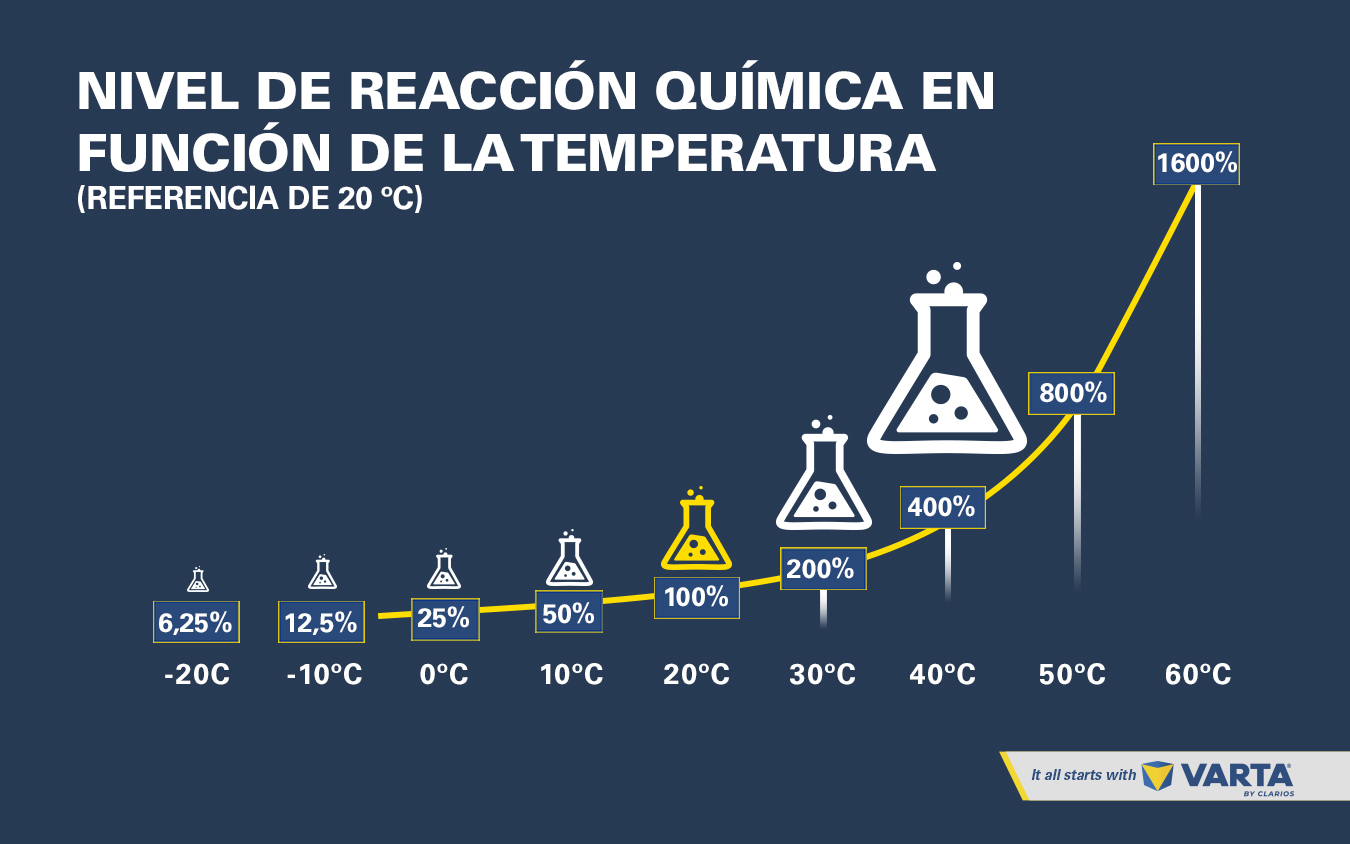 Hemos visto que el calor estival causa daños a la batería y que las altas temperaturas aumentan el nivel de reacción química. Así ocurre cuando la temperatura supera los 20 °C. Si la temperatura baja de 20 °C, las reacciones químicas que se producen dentro de la batería se ralentizan. Si consideramos que 20 °C es la temperatura óptima, la reacción química baja al 50 % con una temperatura de 10 °C, y cuando se alcanza el punto de congelación desciende hasta el 25 %. Esto quiere decir que el rendimiento de la batería puede ser perfecto en verano con una temperatura de 20 °C, mientras que en invierno no pasa nada con 0 °C y hay que cambiar la batería.