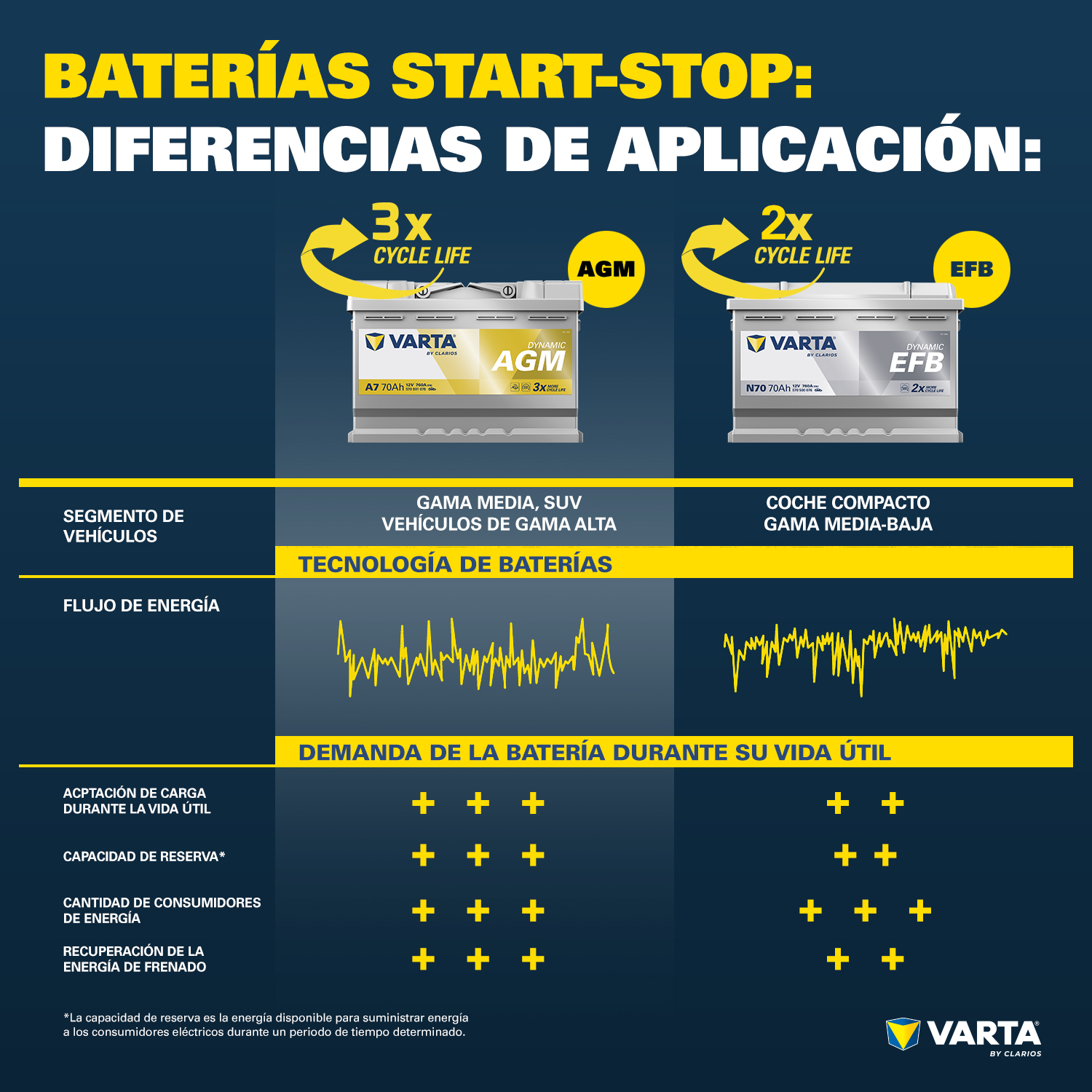 Por lo general, los vehículos con sistemas start-stop simples sin recuperación de la energía de frenado tienen instalada una batería EFB. Ahora bien, incluso en este caso, merece la pena cambiar a una batería AGM: la tecnología start-stop ofrece un funcionamiento fiable y sin anomalías. Por último, las baterías AGM impresionan por su gran capacidad de carga: a lo largo de toda su vida útil, una batería AGM tiene una mejor aceptación de la carga que una batería EFB.