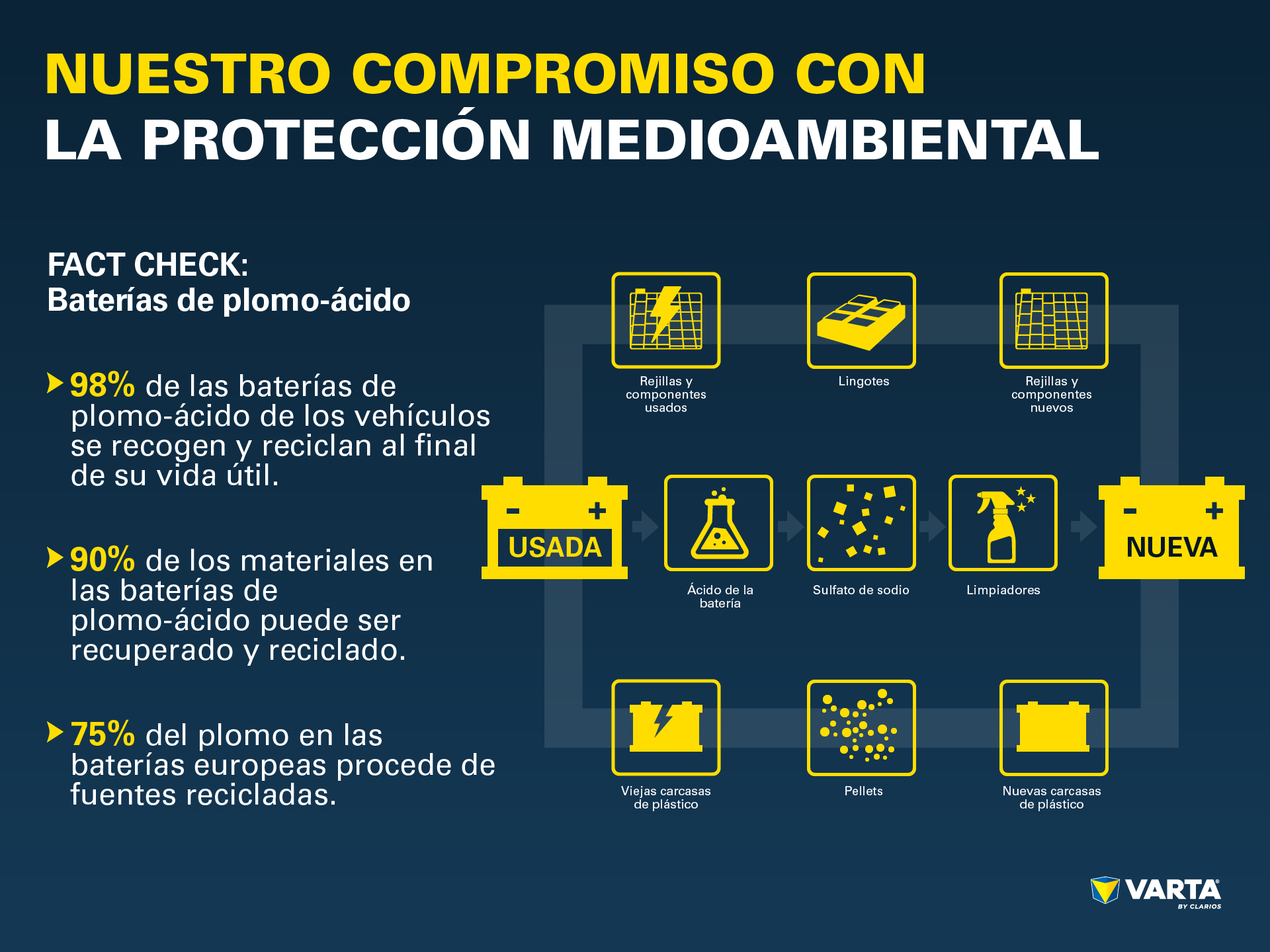 La marca insignia de baterías de automoción de Clarios, VARTA®, contribuye de manera significativa a la sostenibilidad gracias a sus prestaciones técnicas innovadoras, diseño y uso de materiales. La responsabilidad en materia de medioambiente se refleja a lo largo de todo el ciclo de vida. Durante la producción, VARTA recurre a una tecnología vanguardista que combina con procesos eficientes en el uso de los recursos y con la promoción de la sostenibilidad. El sentido de responsabilidad de sus empleados también es sumamente importante. De ahí que la empresa les informe y ayude en relación con temas de protección medioambiental. Además, se les pide a contratistas y proveedores de todo el mundo que cumplan con estas directrices.