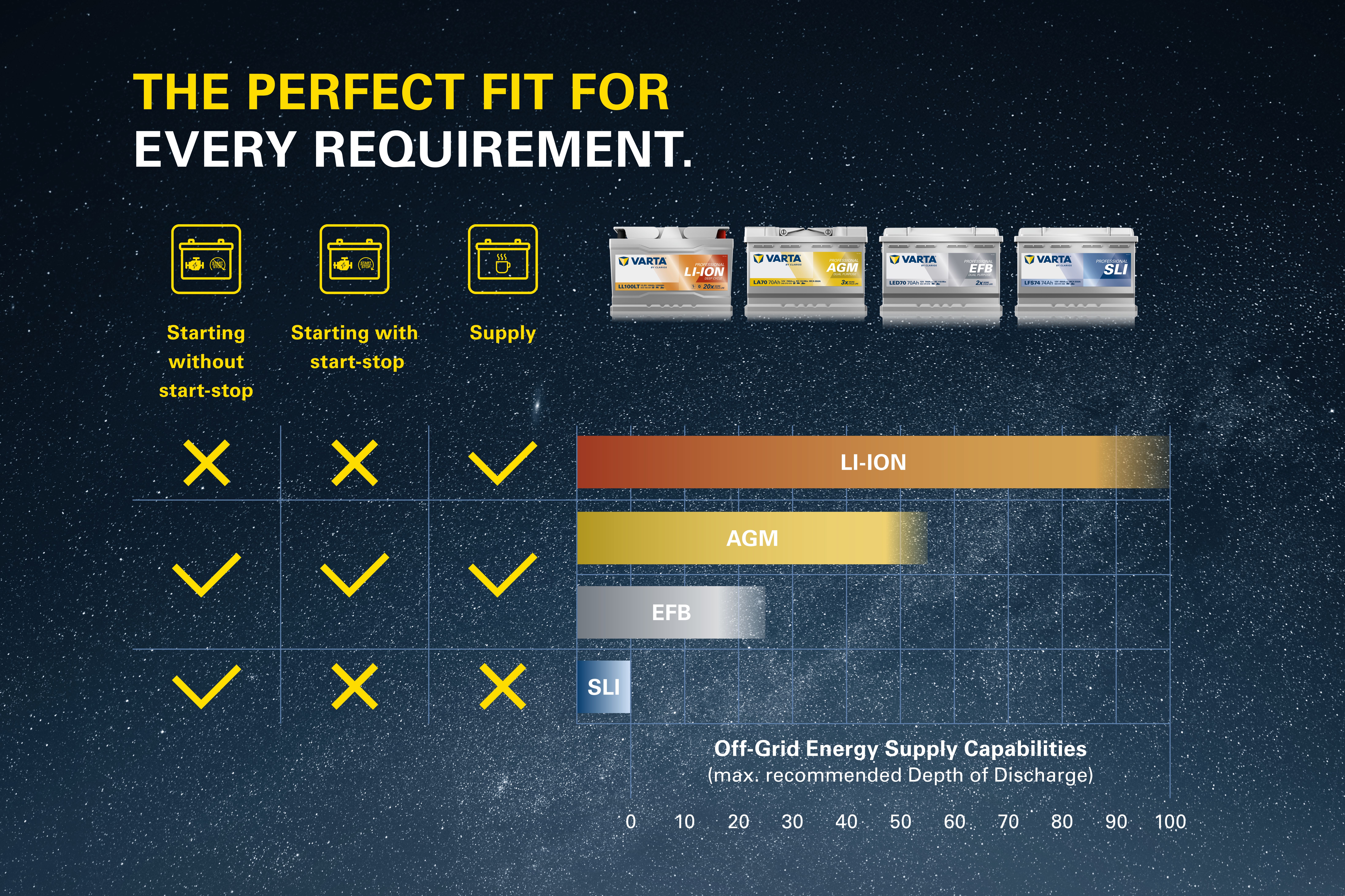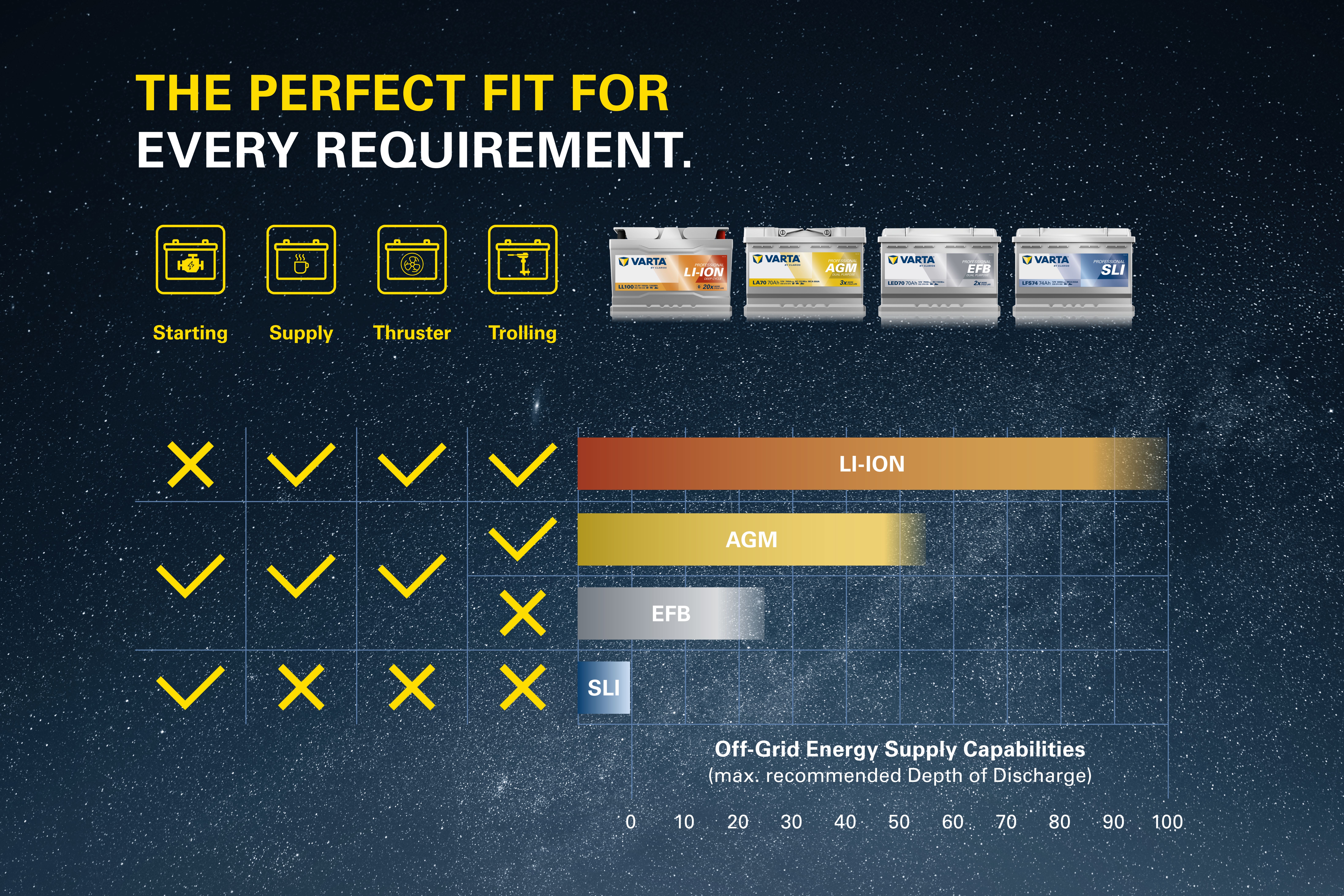 As baterias de lazer convencionais, como a VARTA Professional SLI, são concebidas principalmente para arrancar motores, enquanto as VARTA Professional AGM e VARTA Professional EFBfornecem tanto potência de arranque como energia para os sistemas de bordo. Já as baterias VARTA Professional Li-Ion destinam-se exclusivamente a fornecer energia fiável e eficiente para todas as aplicações de lazer.