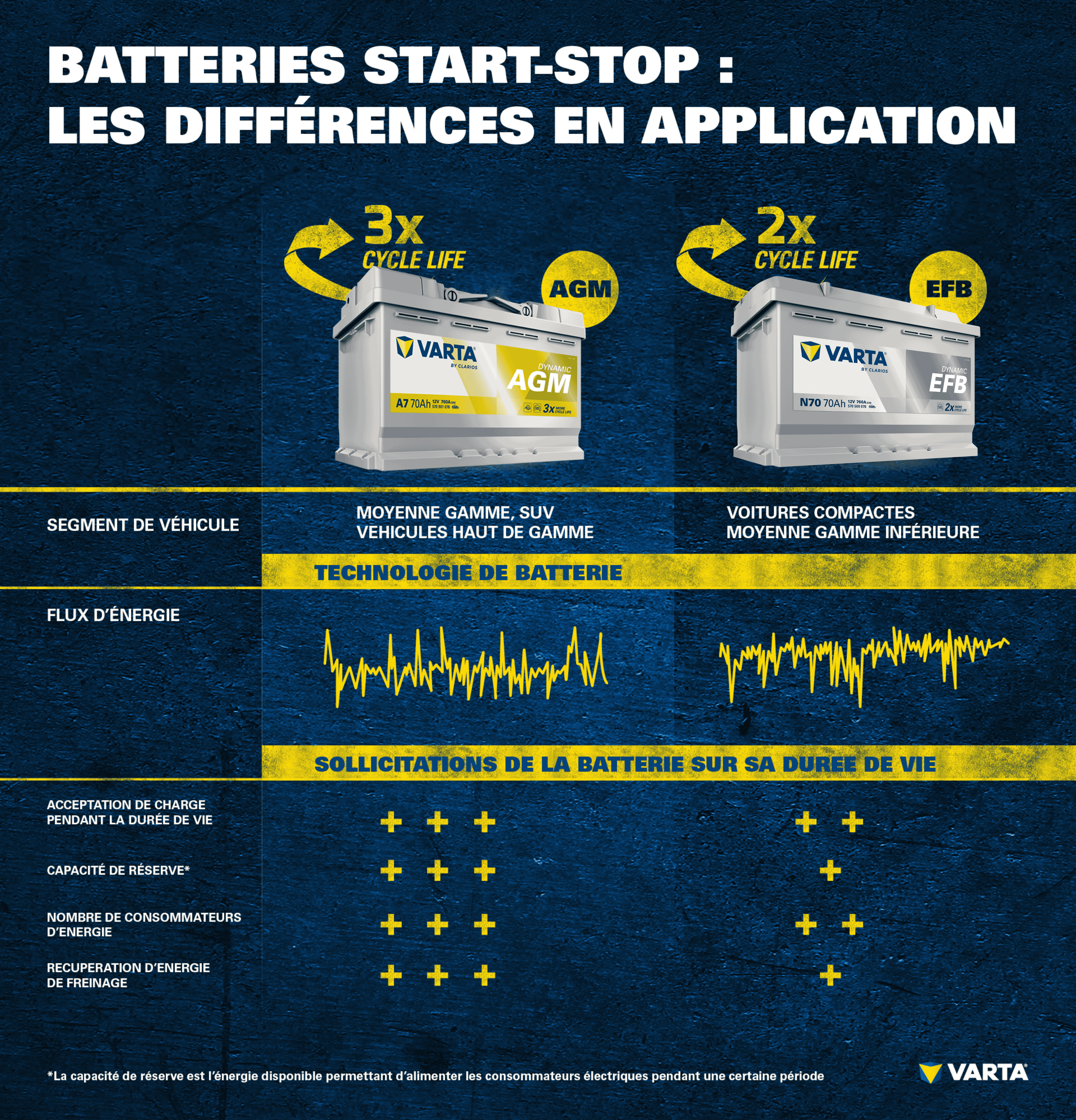 La technologie Start-Stop équipée d'une batterie EFB ne coupe le moteur que dans 39%* des cas par rapport à une batterie AGM. La combinaison d'une batterie AGM et d'un système Start-Stop est économique, puissante et fiable.