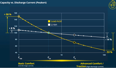 Li-Ion batteries offer high depth of discharge and superior durability compared to lead-acid battery technology, providing a longer lifetime, although AGM batteries remain sufficient for most applications. This results in a significantly longer cycle life, making them a cost-effective choice over time.