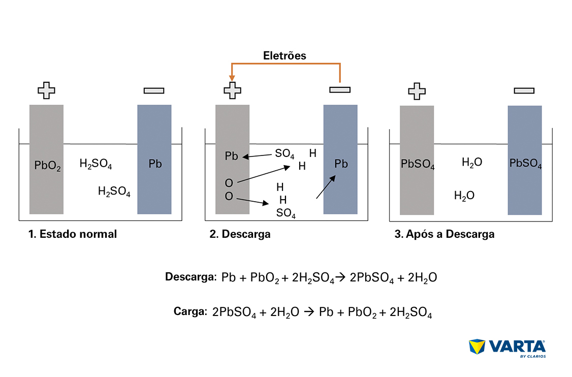 - Neste, o oxigénio liga-se ao hidrogénio para formar água (H2O). À medida que o ácido sulfúrico é consumido pela formação de sulfato de chumbo, a concentração da solução electrolítica diminui. Quando a concentração do ácido sulfúrico desce abaixo de um determinado nível, a bateria tem de ser recarregada.