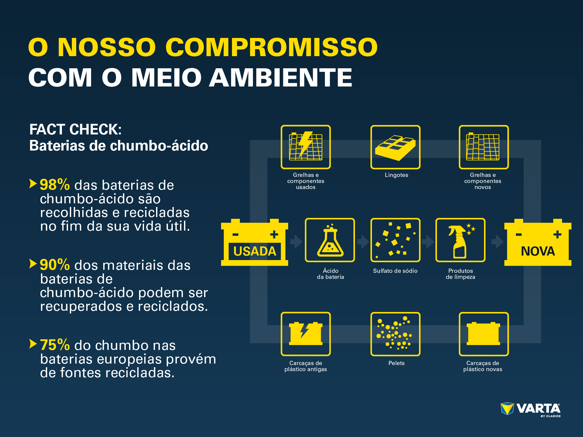 Só na Europa, este sistema levou a que 100% de todas as baterias de chumbo-ácido fossem recolhidas no final da sua vida útil e recicladas com sucesso. Em cada bateria, 100 % dos materiais podem ser recuperados e reutilizados. É por isso que 75 % do chumbo das baterias de veículos vendidas atualmente é obtido a partir de fontes recicladas. Isto conserva os recursos e reduz ainda mais as emissões de gases com efeito de estufa que teriam ocorrido com a compra de novos materiais para as baterias.