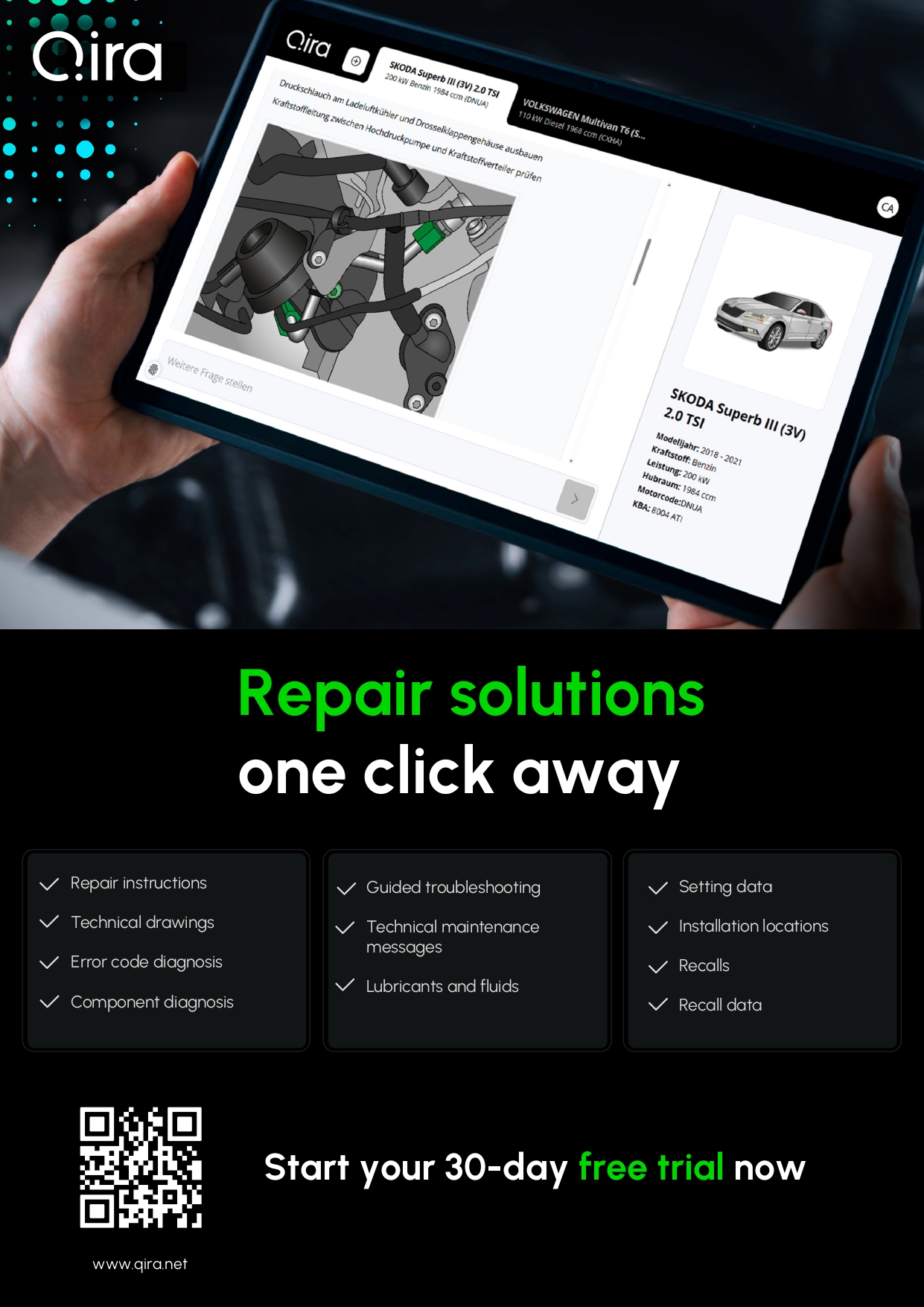 Now available to all workshops in Germany, Qira provides instant access to cross-brand, verified repair knowledge – directly from OEMs and industry experts. Workshops can start with a free 30-day trial, either by registering directly through Qira or through participating wholesalers.