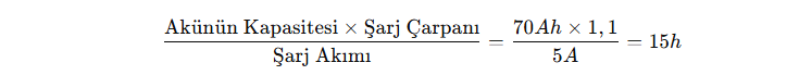Bir aküyü şarj etmek zaman alır. Tipik olarak, 12 ila 24 saat yeterli bir şarj süresidir. Örneğin, sıradan bir 70Ah akünün 5A şarj cihazı ile tamamen şarj olması için yaklaşık 15 saat gerekir. İki saatlik kısa bir şarj, aküyü yalnızca %15 seviyesine getirecektir. Bu, hızlı bir destek için yeterli olacaktır ancak aküyü tam olarak şarj etmeyecektir. Bir akünün toplam şarj süresini hesaplamak için akünün Ah değerini alın ve şarj cihazı değerine (A) bölün. Ardından aküyü tamamen doldurmak için ekstra süre olarak yaklaşık %10 ekleyin